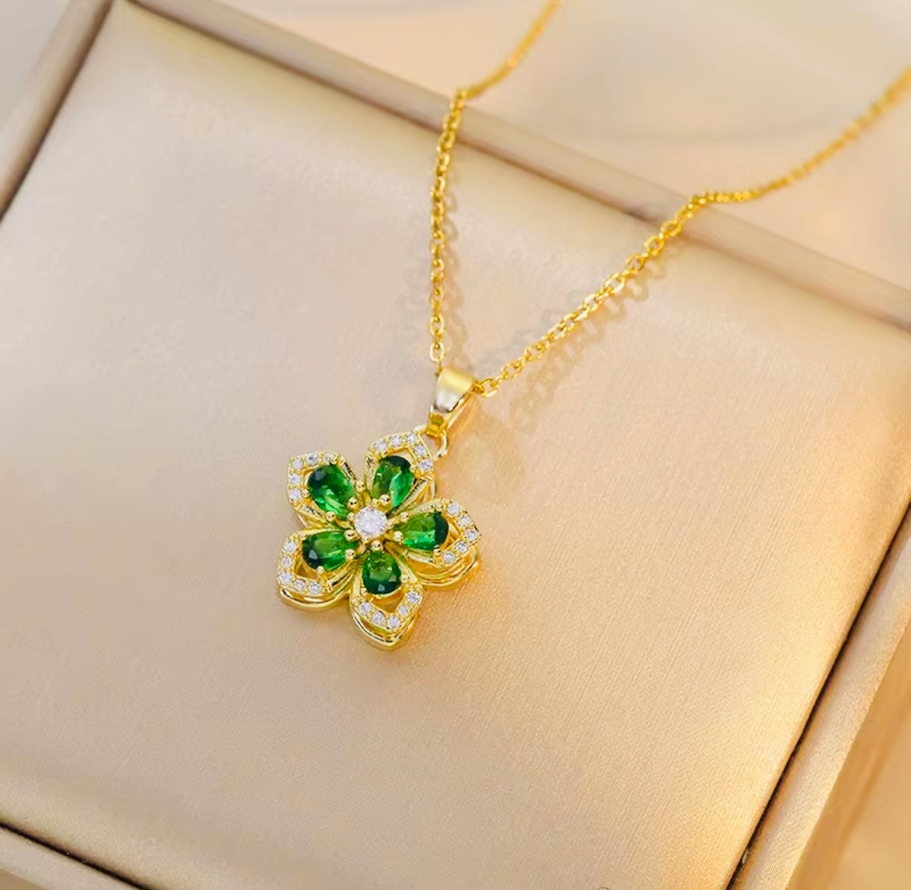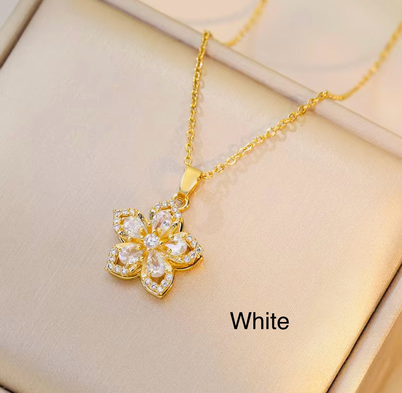 Rotating Flower Necklace for Women | Gold Crystal Blossom | Minimalist Gift for Her | Green, Pink, White & Red